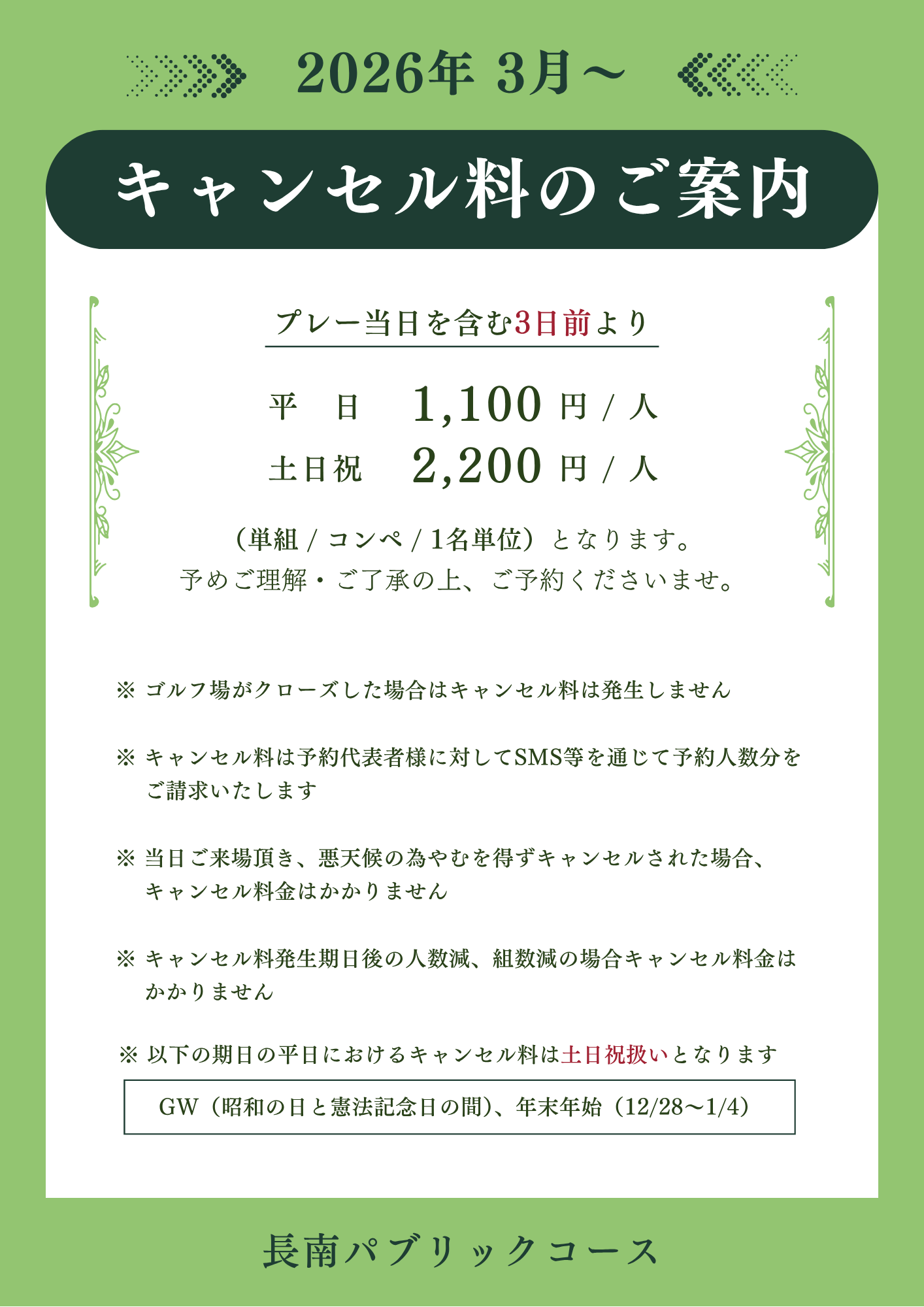 ※ ご予約受付期間はプレー日の3ヶ月前〜5日前までです。